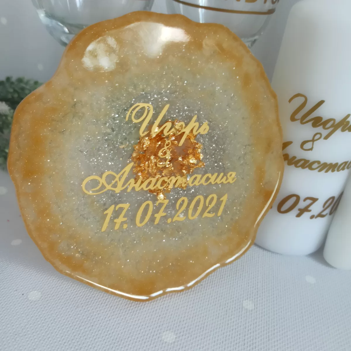 Именная подставка для колец из эпоксидной смолы. Цвет надписей на выбор