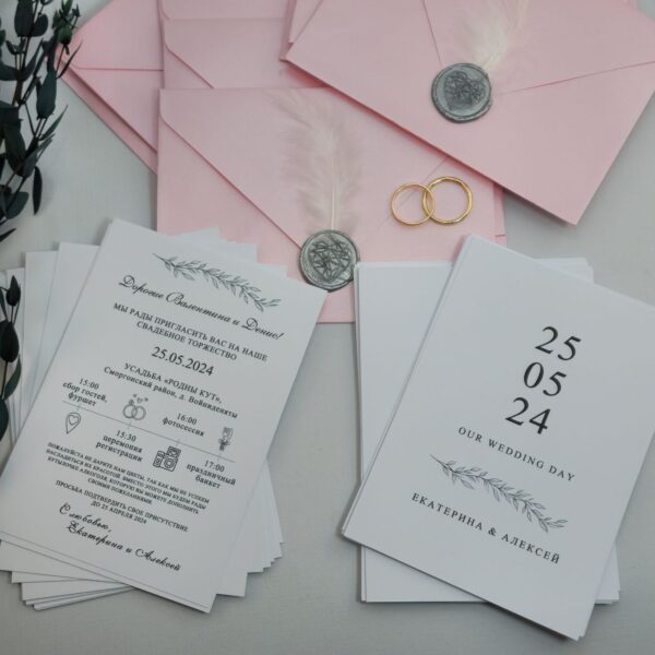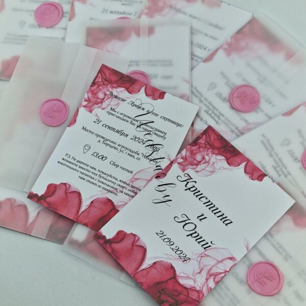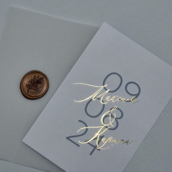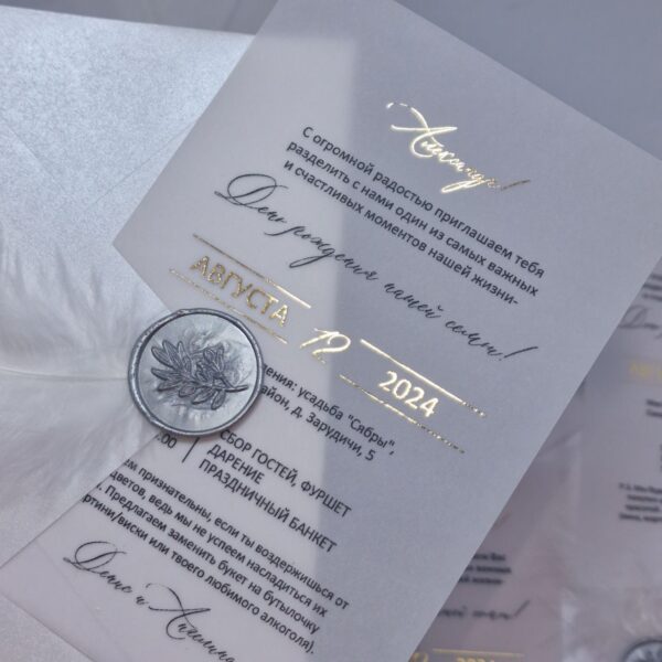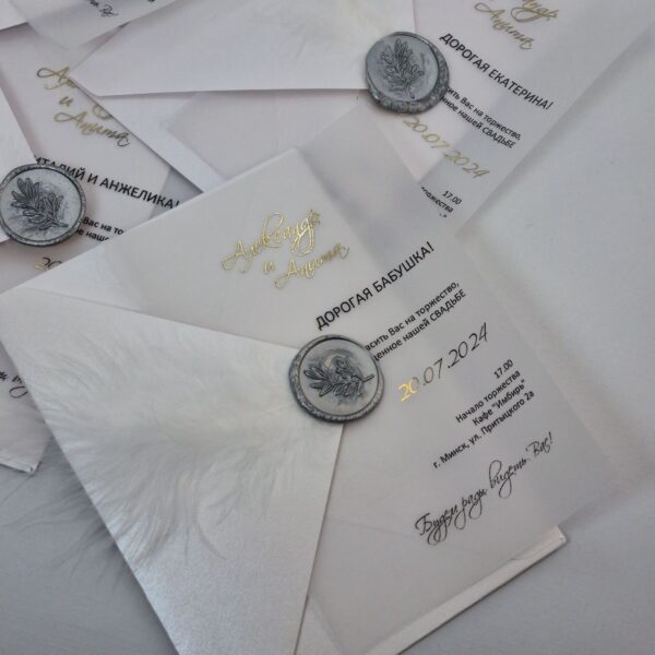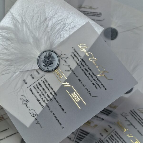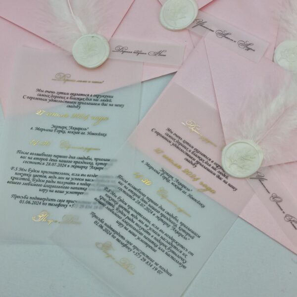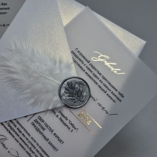 Пригласительные на кальке с золочением, перламутровым конвертом, оттиском, пером