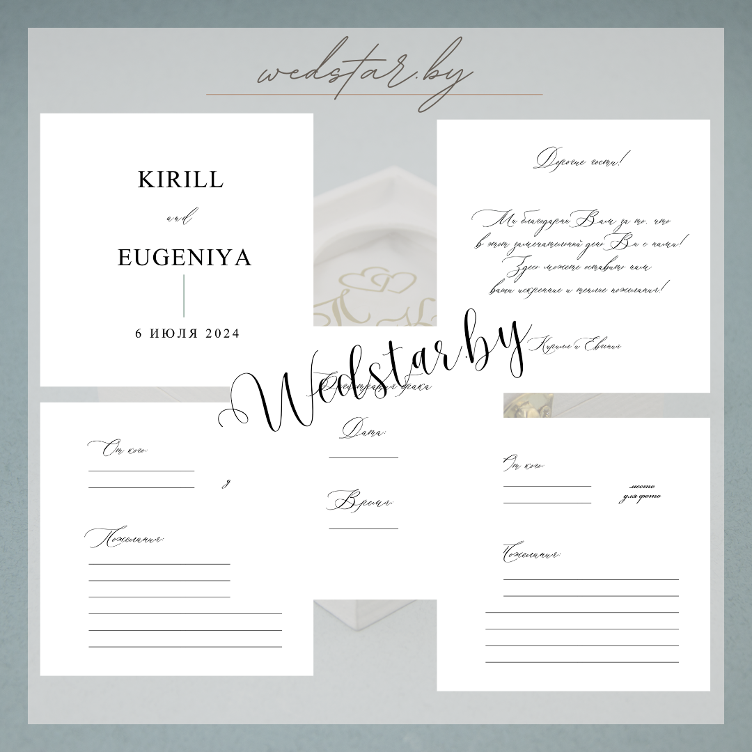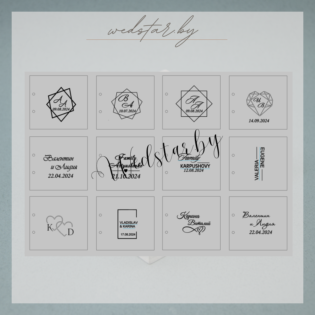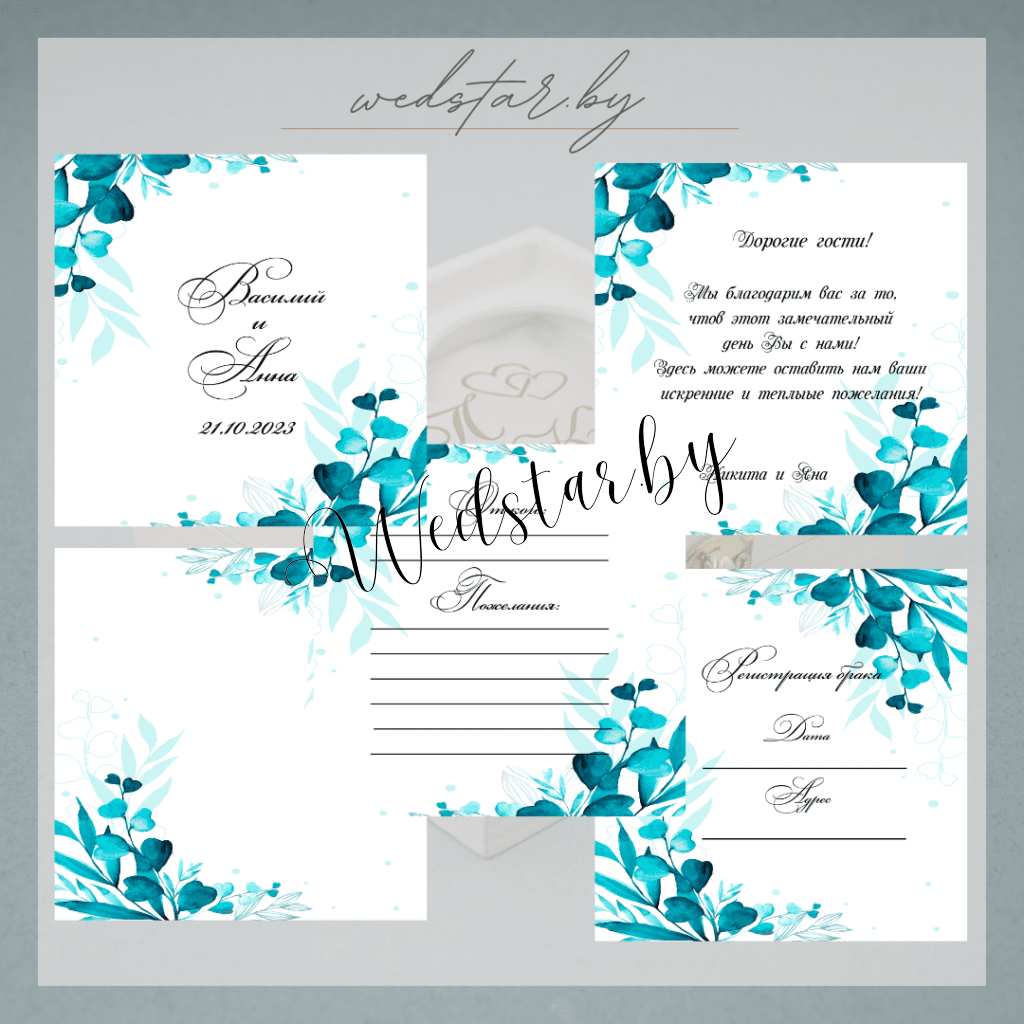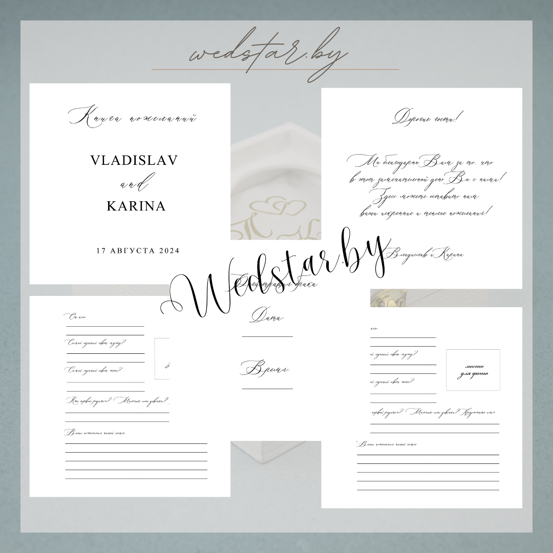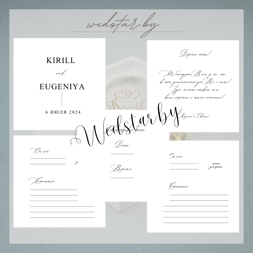 Макеты книг пожеланий Текст, шрифт макетов согласовывается индивидуально с каждой невестой. К заказу доступно 2 вида книг: с обложкой из оргстекла и без обложкиКоличество страниц в книге – 25 стр.Цвет надписей на обложке оргстекла на выбор: белые, черные, золото, сереброКнига пожеланий может быть в одном стиле с пригласительными. Варианты надписей на обложке из оргстекла