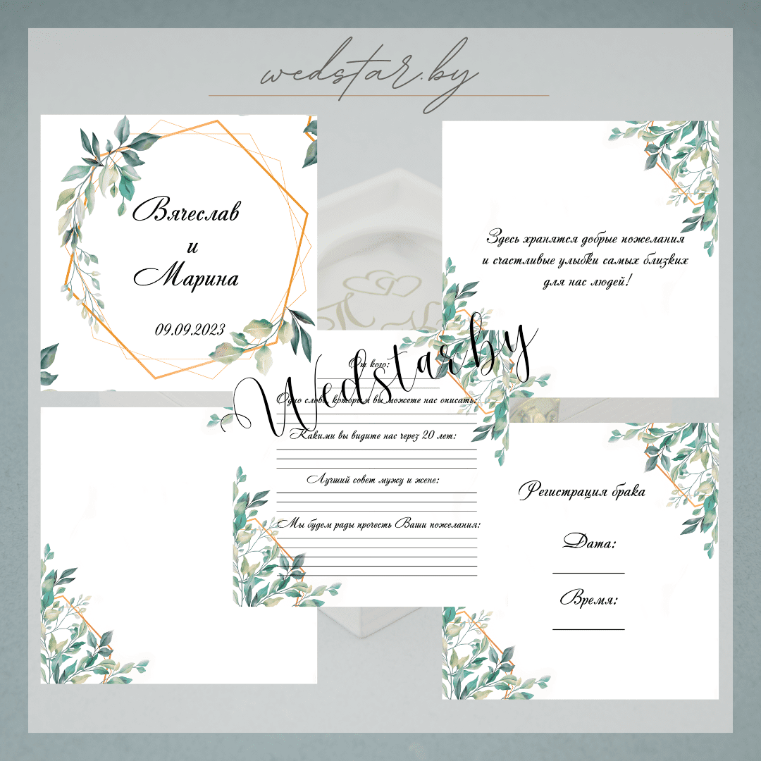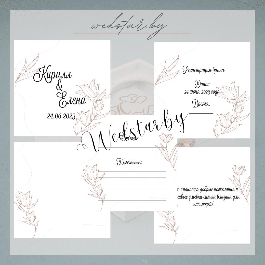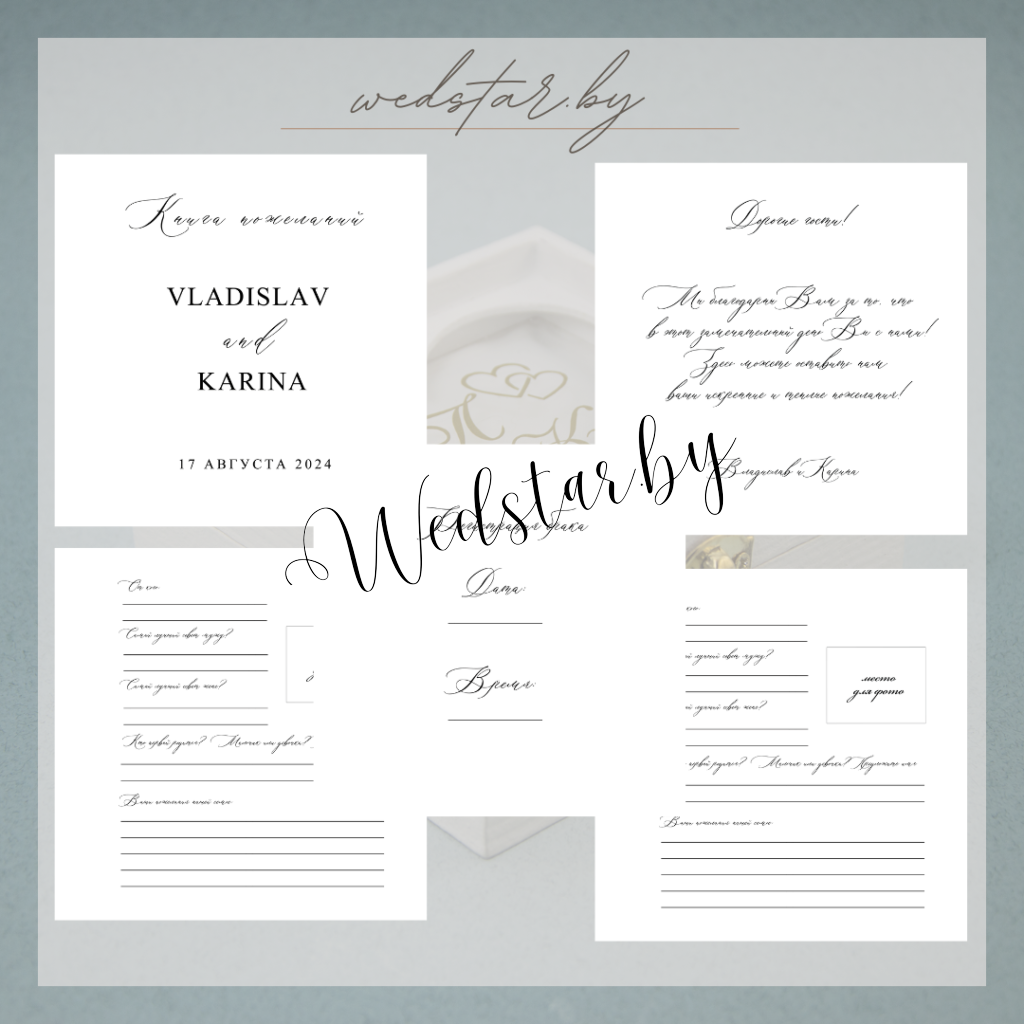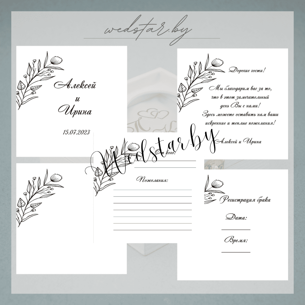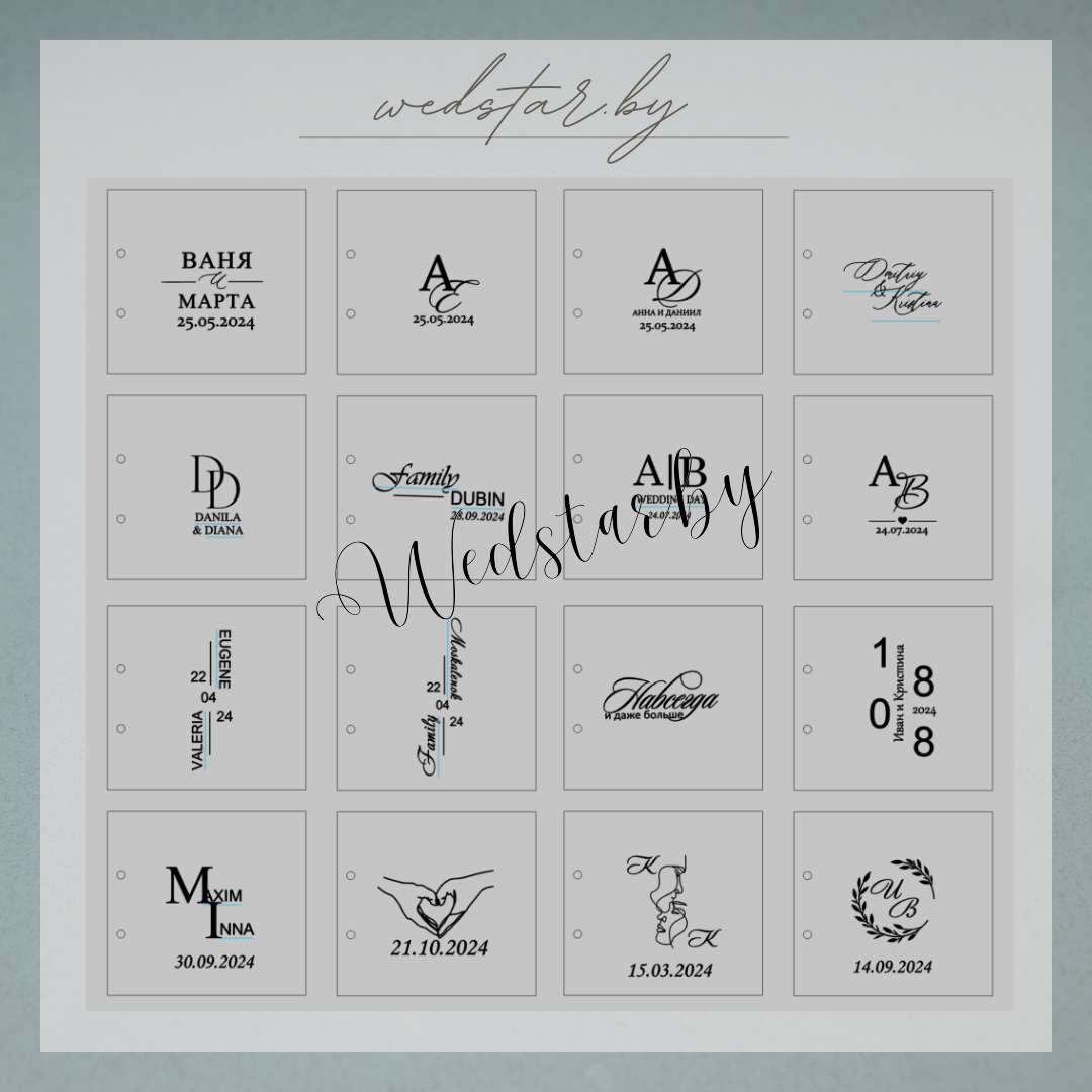 Макеты книг пожеланий Текст, шрифт макетов согласовывается индивидуально с каждой невестой. К заказу доступно 2 вида книг: с обложкой из оргстекла и без обложкиКоличество страниц в книге – 25 стр.Цвет надписей на обложке оргстекла на выбор: белые, черные, золото, сереброКнига пожеланий может быть в одном стиле с пригласительными. Варианты надписей на обложке из оргстекла