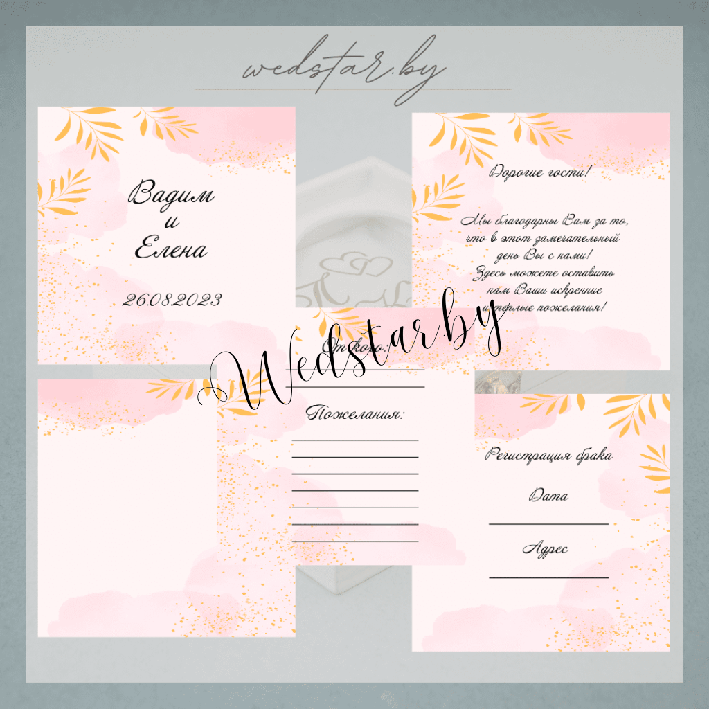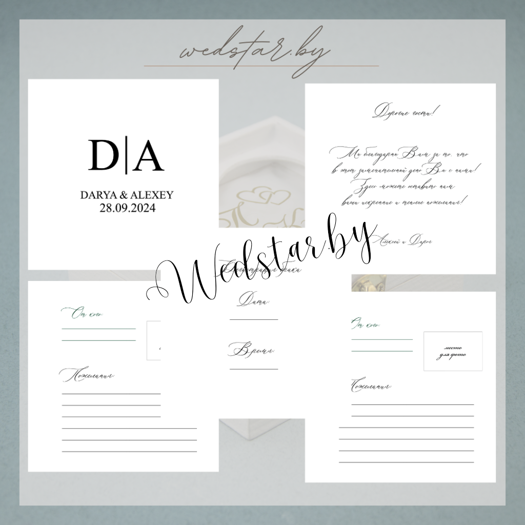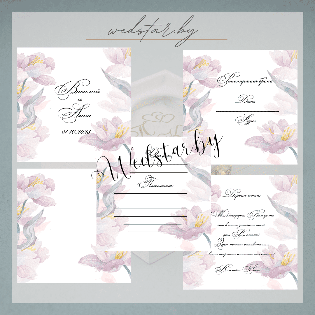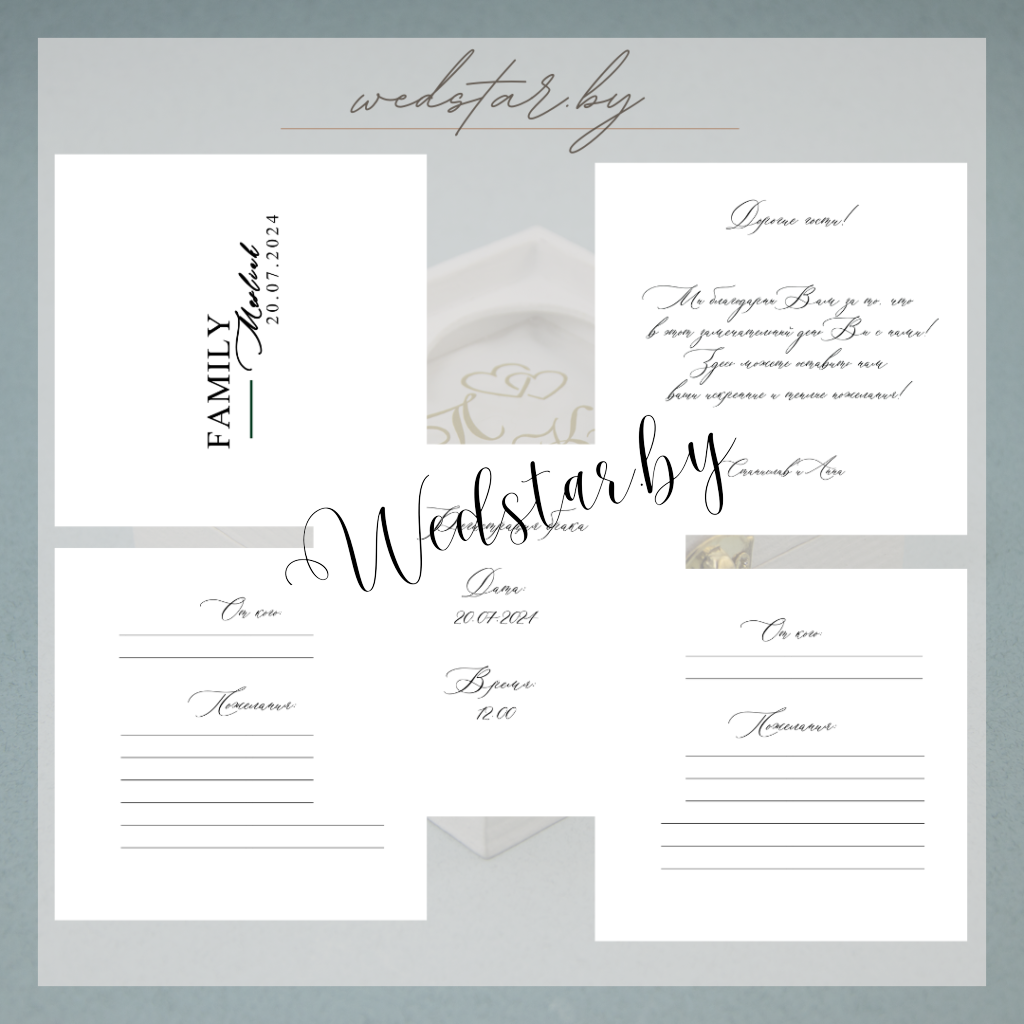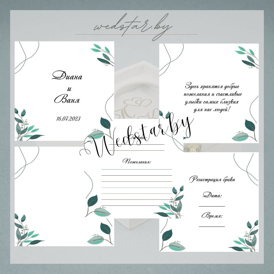 Макеты книг пожеланий Текст, шрифт макетов согласовывается индивидуально с каждой невестой. К заказу доступно 2 вида книг: с обложкой из оргстекла и без обложкиКоличество страниц в книге – 25 стр.Цвет надписей на обложке оргстекла на выбор: белые, черные, золото, сереброКнига пожеланий может быть в одном стиле с пригласительными. Варианты надписей на обложке из оргстекла