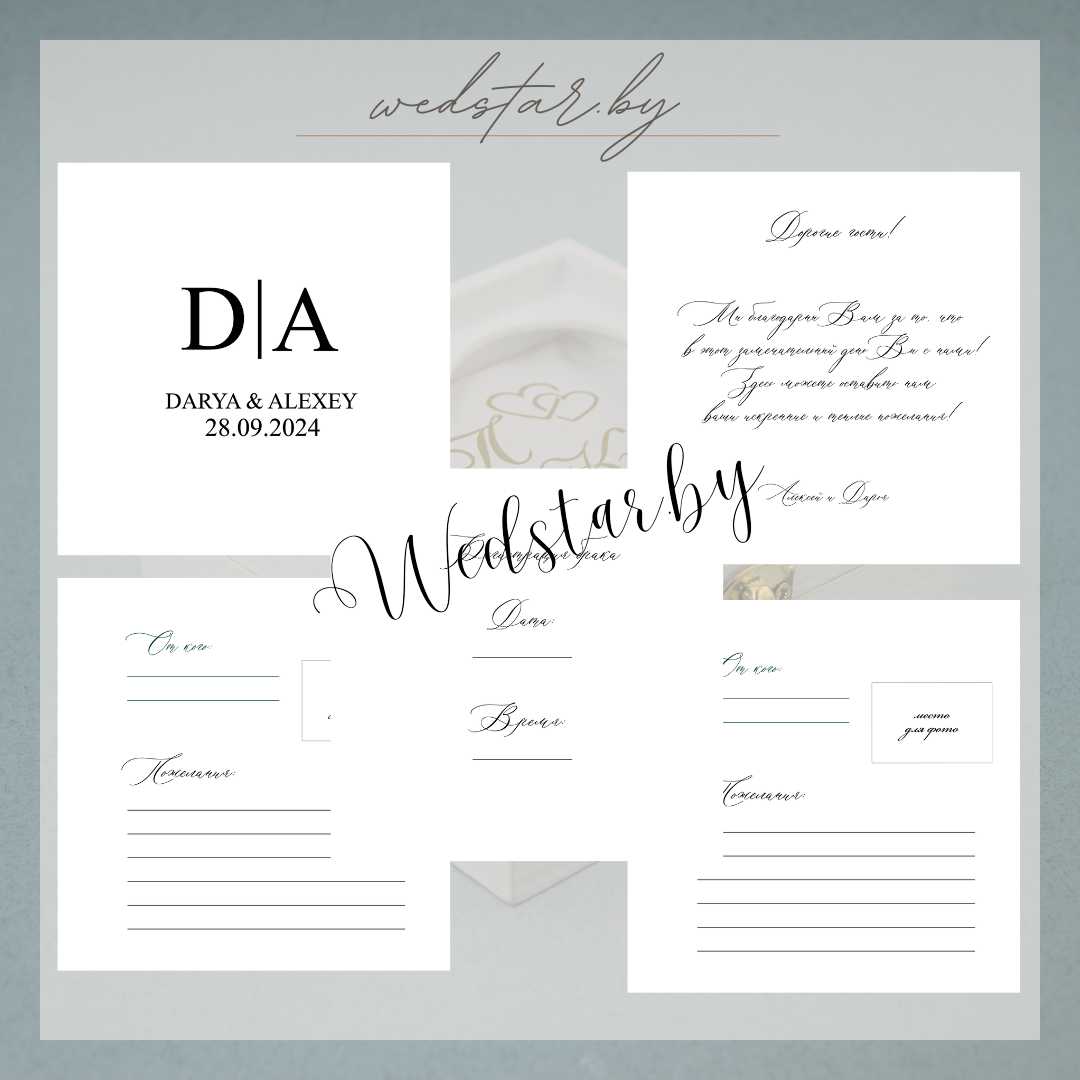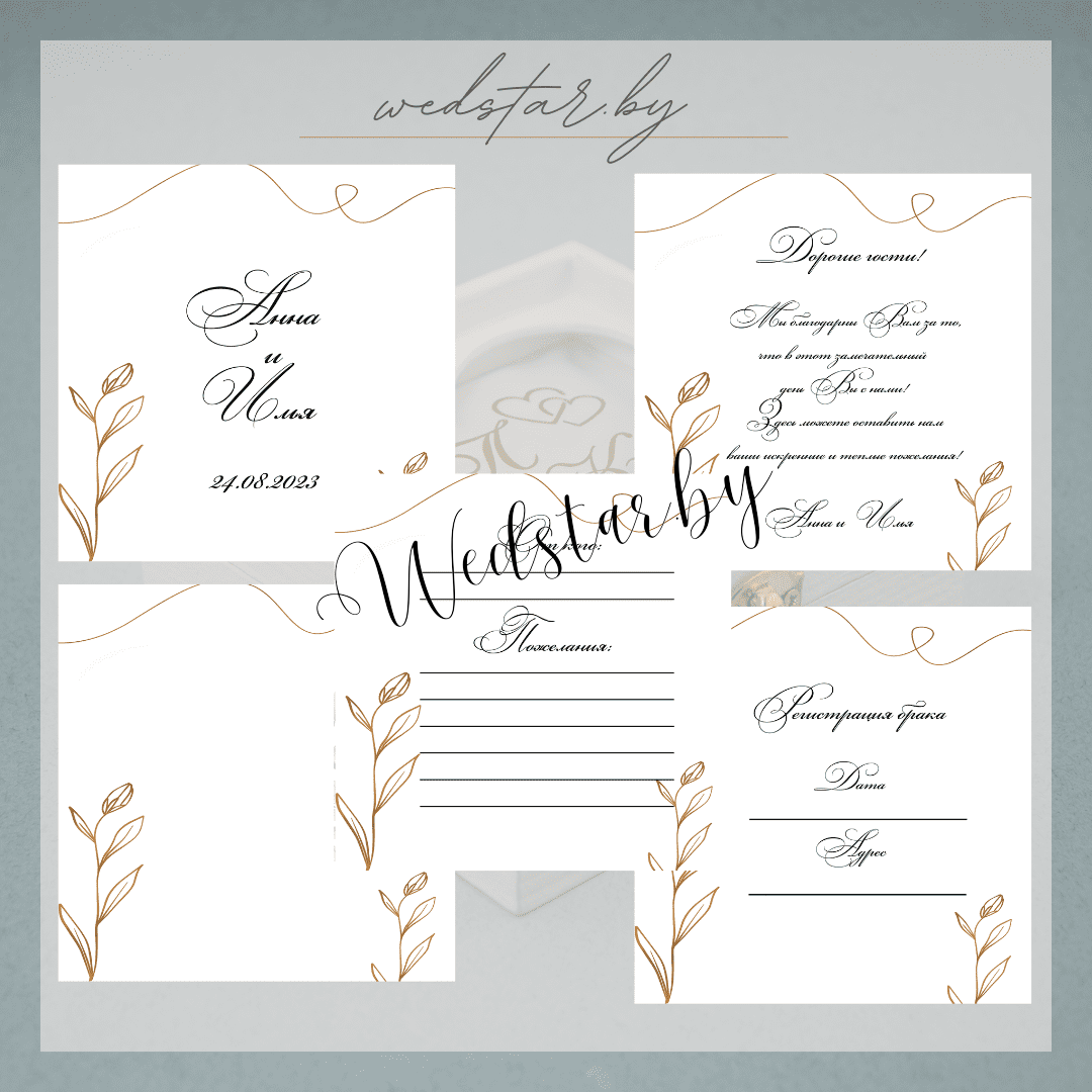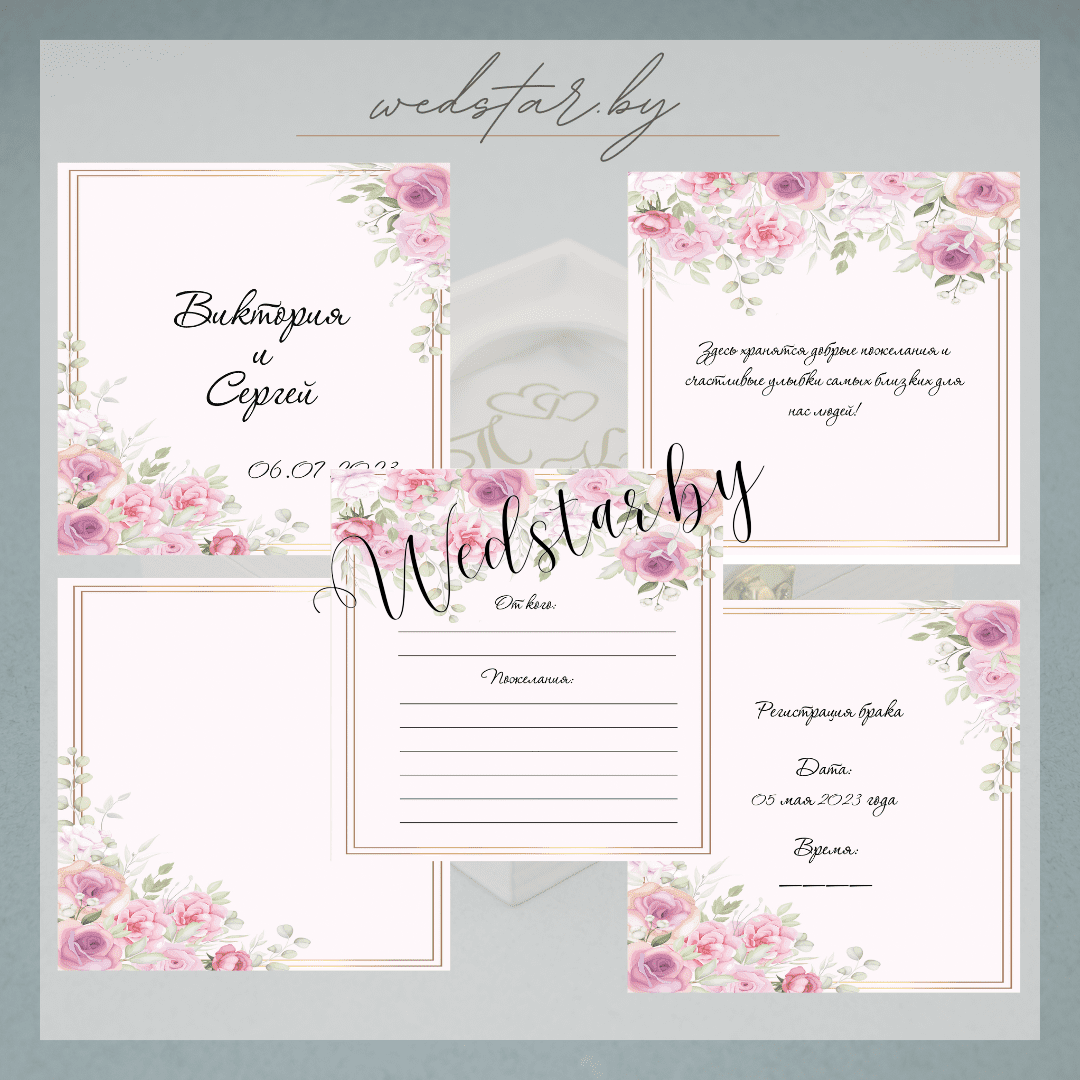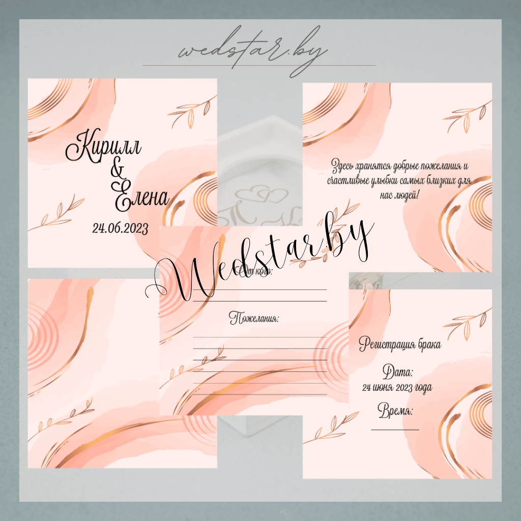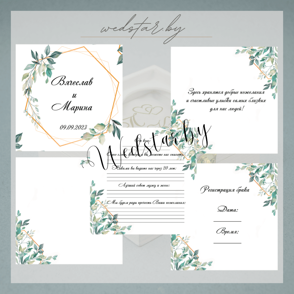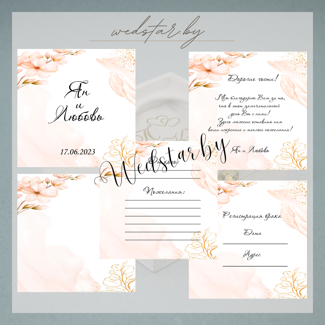 Макеты книг пожеланий Текст, шрифт макетов согласовывается индивидуально с каждой невестой. К заказу доступно 2 вида книг: с обложкой из оргстекла и без обложкиКоличество страниц в книге – 25 стр.Цвет надписей на обложке оргстекла на выбор: белые, черные, золото, сереброКнига пожеланий может быть в одном стиле с пригласительными. Варианты надписей на обложке из оргстекла