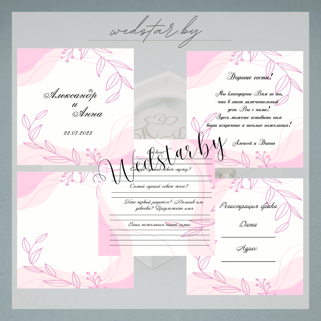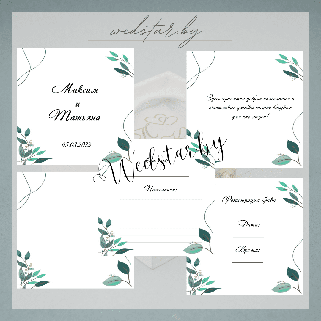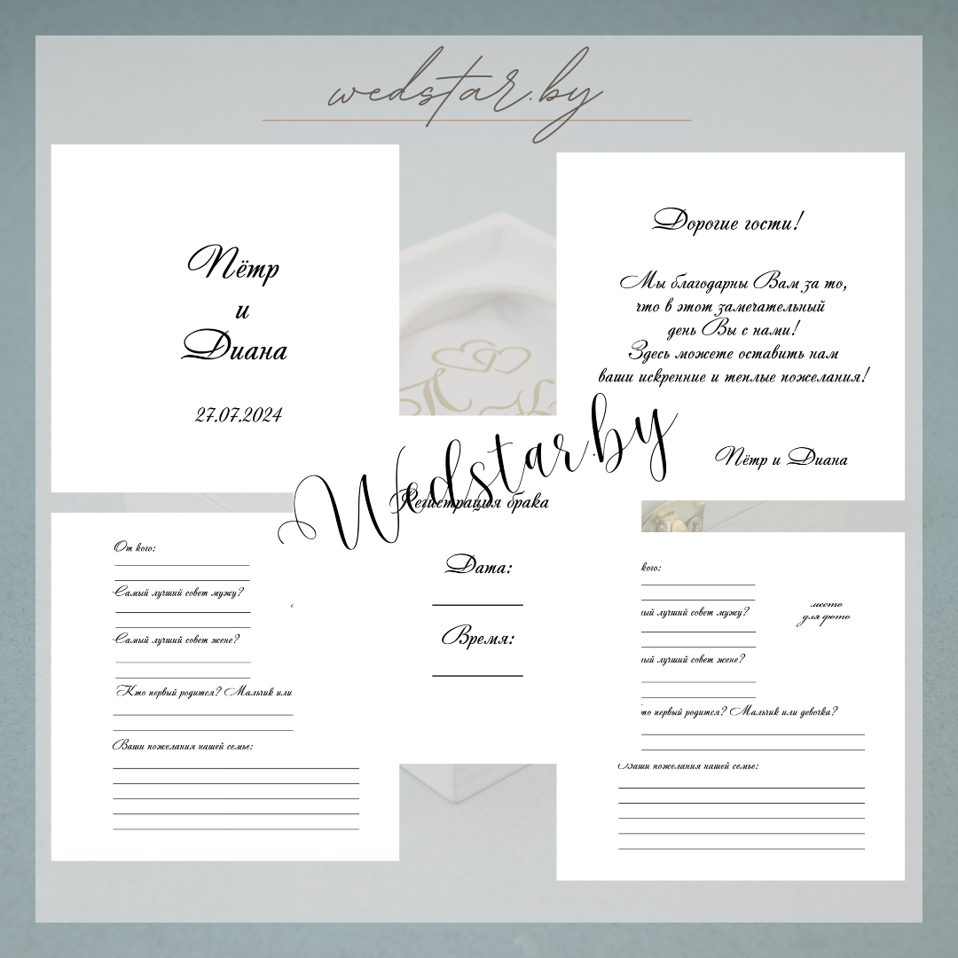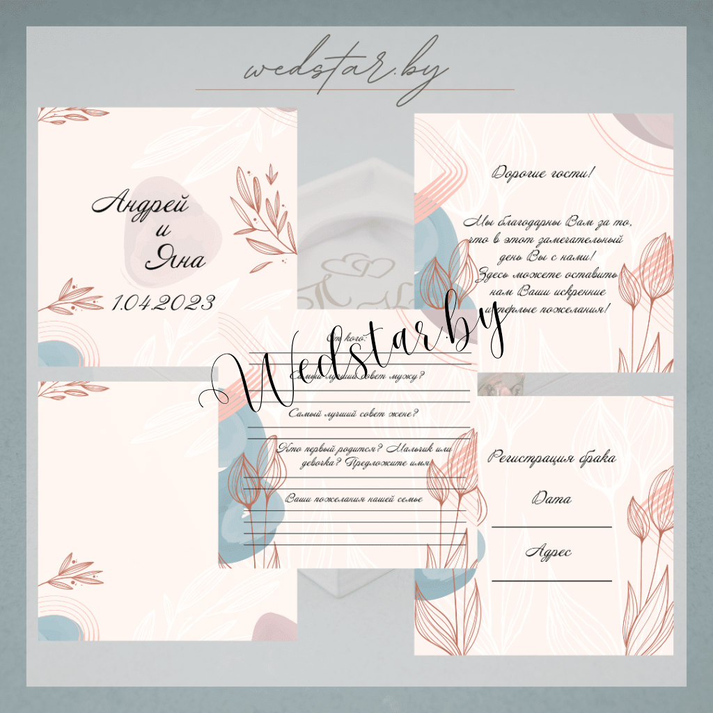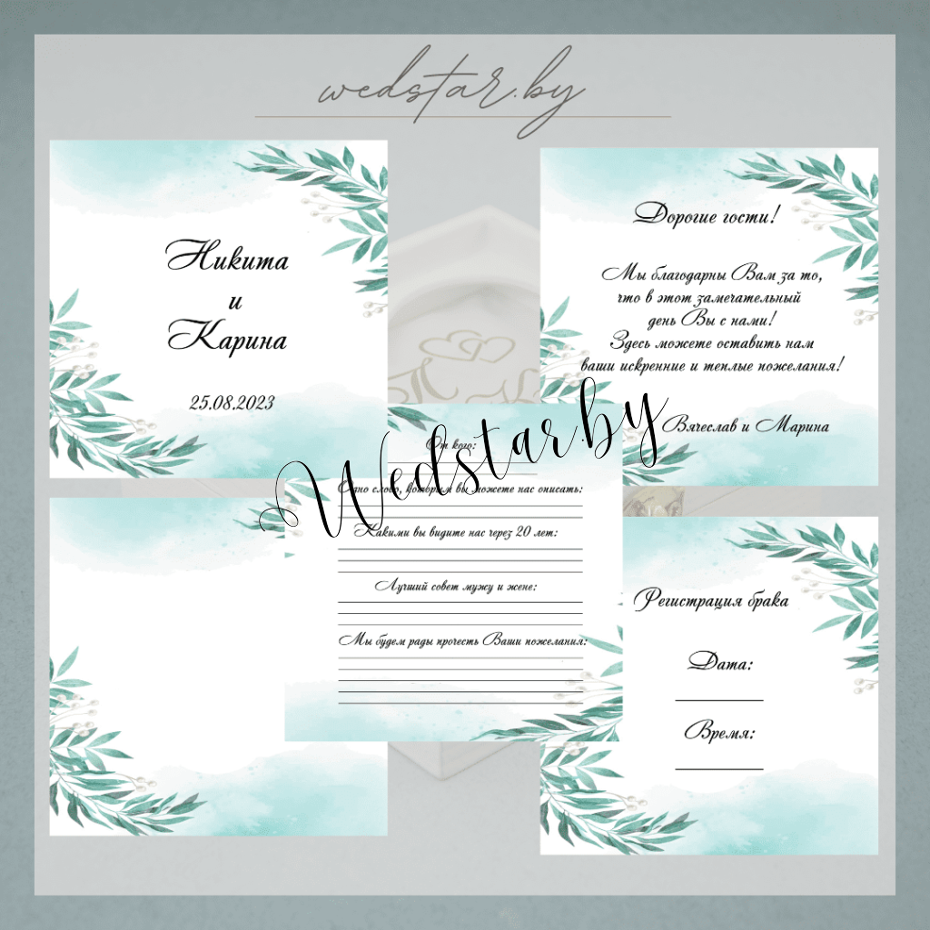 Макеты книг пожеланий Текст, шрифт макетов согласовывается индивидуально с каждой невестой. К заказу доступно 2 вида книг: с обложкой из оргстекла и без обложкиКоличество страниц в книге – 25 стр.Цвет надписей на обложке оргстекла на выбор: белые, черные, золото, сереброКнига пожеланий может быть в одном стиле с пригласительными. Варианты надписей на обложке из оргстекла